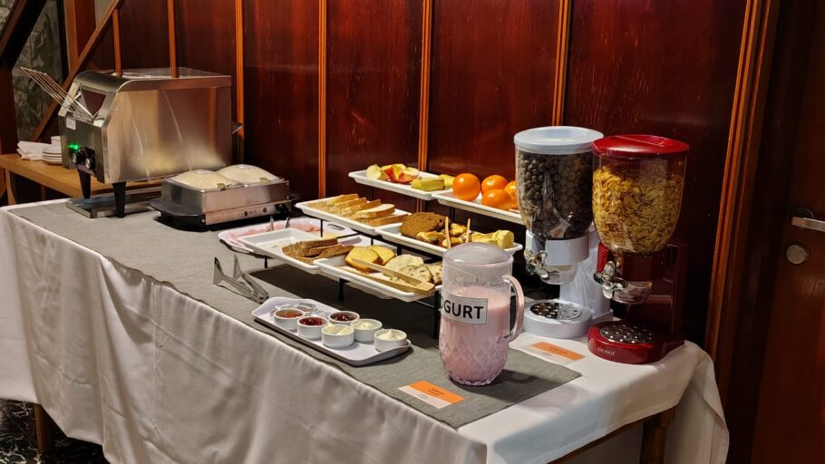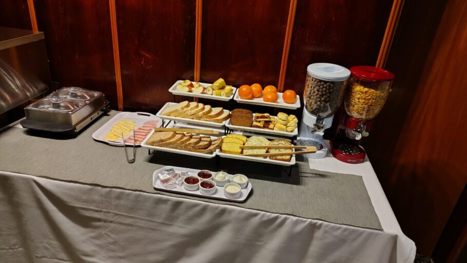 Cuánta con variedad de panes, variedad de budines, jamón, queso, huevo revuelto, queso crema, manteca, mermeladas, fruta, jugos e infusiones, yogur y cereales.